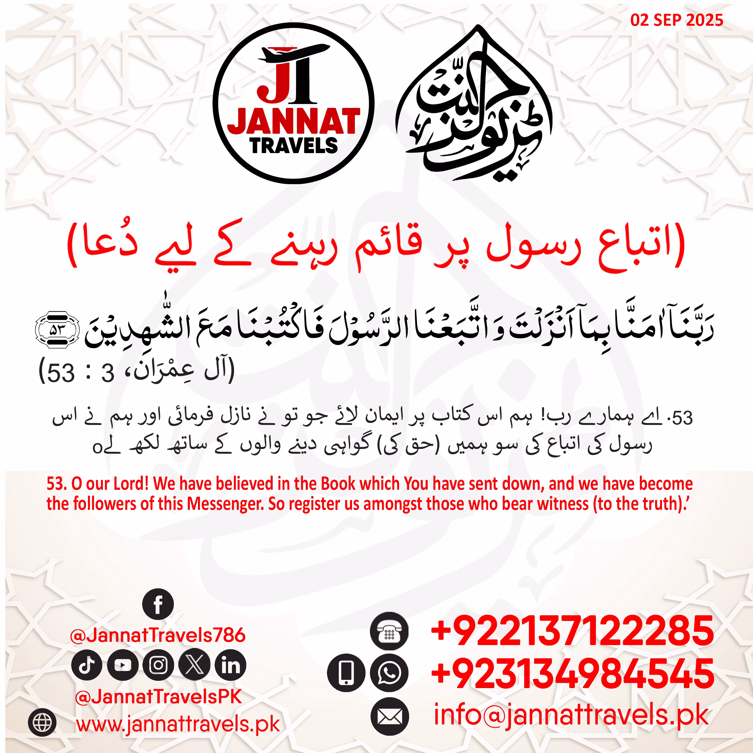 🌸 (ایمان اور اتباعِ رسول کی دعا) 🌸 رَبَّنَاۤ اٰمَنَّا بِمَاۤ اَنۡزَلۡتَ وَ اتَّبَعۡنَا الرَّسُوۡلَ فَاکۡتُبۡنَا مَعَ الشّٰہِدِیۡنَ ﴿۵۳﴾✨ "اے…
